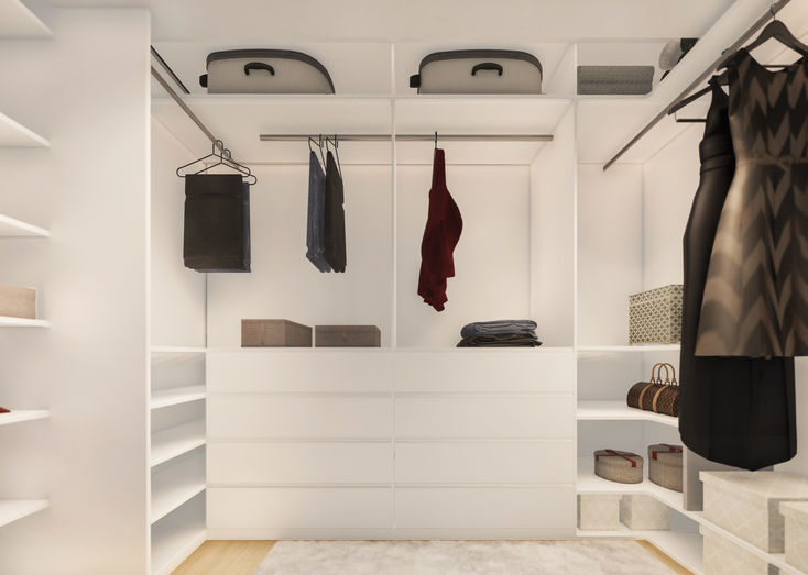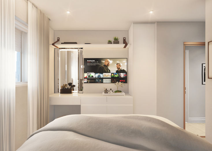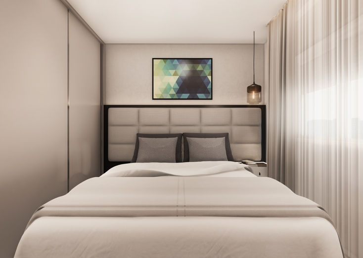 Utilizamos tons neutros e suaves com tons de cinza e branco na maioria dos mobiliários dos dormitórios, cozinha e área de serviço e usamos tons mais alegres nos objetos decorativos e tapeçarias.